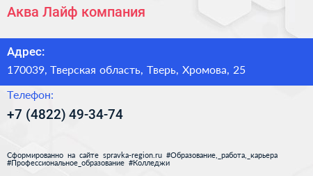 Аква-Лайф, компания по адресу 170039, Тверская область, Тверь, Хромова, 25 в дальнейшем Организация, размещена в следующих категориях:
