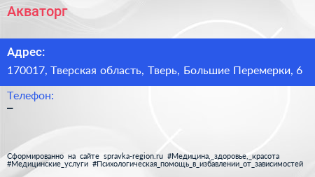 Акваторг по адресу 170017, Тверская область, Тверь, Большие Перемерки, 6 в дальнейшем Организация, размещена в следующих категориях: