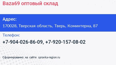 Baza69, оптовый склад по адресу 170028, Тверская область, Тверь, Коминтерна, 87 в дальнейшем Организация, размещена в следующих категориях: