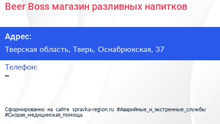 Beer Boss, магазин разливных напитков по адресу Тверская область, Тверь, Оснабрюкская, 37 в дальнейшем Организация, размещена в следующих категориях: