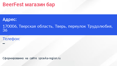 BeerFest, магазин-бар по адресу 170006, Тверская область, Тверь, переулок Трудолюбия, 36 в дальнейшем Организация, размещена в следующих категориях: