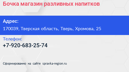 Бочка, магазин разливных напитков по адресу 170039, Тверская область, Тверь, Хромова, 25 в дальнейшем Организация, размещена в следующих категориях: