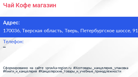 Чай & Кофе, магазин по адресу 170036, Тверская область, Тверь, Петербургское шоссе, 91 в дальнейшем Организация, размещена в следующих категориях: