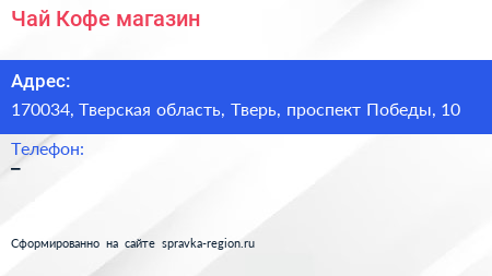 Чай & Кофе, магазин по адресу 170034, Тверская область, Тверь, проспект Победы, 10 в дальнейшем Организация, размещена в следующих категориях: