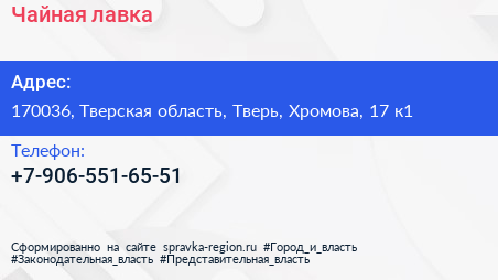 Чайная лавка по адресу 170036, Тверская область, Тверь, Хромова, 17 к1 в дальнейшем Организация, размещена в следующих категориях: