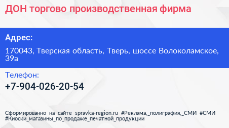 ДОН, торгово-производственная фирма по адресу 170043, Тверская область, Тверь, шоссе Волоколамское, 39а в дальнейшем Организация, размещена в следующих категориях: