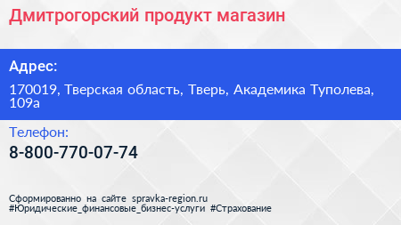 Дмитрогорский продукт, магазин по адресу 170019, Тверская область, Тверь, Академика Туполева, 109а в дальнейшем Организация, размещена в следующих категориях: