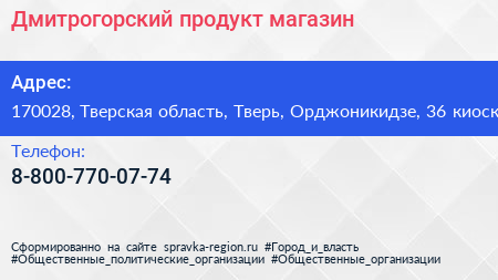 Дмитрогорский продукт, магазин по адресу 170028, Тверская область, Тверь, Орджоникидзе, 36 киоск в дальнейшем Организация, размещена в следующих категориях: