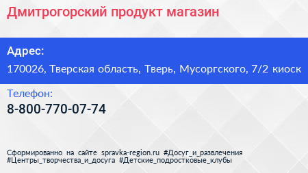 Дмитрогорский продукт, магазин по адресу 170026, Тверская область, Тверь, Мусоргского, 7/2 киоск в дальнейшем Организация, размещена в следующих категориях: