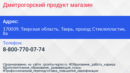 Дмитрогорский продукт, магазин по адресу 170039, Тверская область, Тверь, проезд Стеклопластик, 8а в дальнейшем Организация, размещена в следующих категориях: