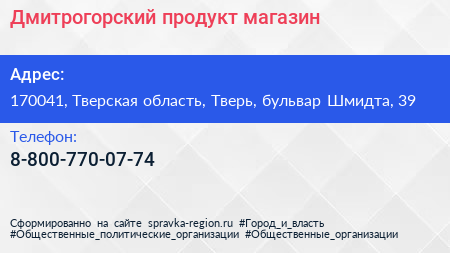 Дмитрогорский продукт, магазин по адресу 170041, Тверская область, Тверь, бульвар Шмидта, 39 в дальнейшем Организация, размещена в следующих категориях: