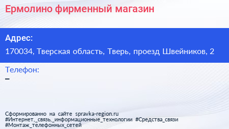 Ермолино, фирменный магазин по адресу 170034, Тверская область, Тверь, проезд Швейников, 2 в дальнейшем Организация, размещена в следующих категориях: