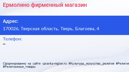 Ермолино, фирменный магазин по адресу 170026, Тверская область, Тверь, Благоева, 4 в дальнейшем Организация, размещена в следующих категориях: