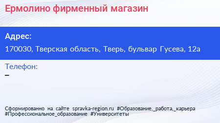 Ермолино, фирменный магазин по адресу 170030, Тверская область, Тверь, бульвар Гусева, 12а в дальнейшем Организация, размещена в следующих категориях: