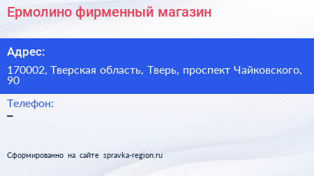 Ермолино, фирменный магазин по адресу 170002, Тверская область, Тверь, проспект Чайковского, 90 в дальнейшем Организация, размещена в следующих категориях: