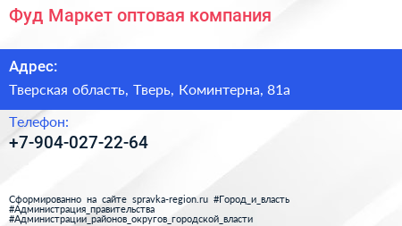 Фуд Маркет, оптовая компания по адресу Тверская область, Тверь, Коминтерна, 81а в дальнейшем Организация, размещена в следующих категориях: