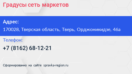Градусы, сеть маркетов по адресу 170028, Тверская область, Тверь, Орджоникидзе, 46а в дальнейшем Организация, размещена в следующих категориях: