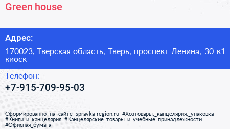 Green house по адресу 170023, Тверская область, Тверь, проспект Ленина, 30 к1 киоск в дальнейшем Организация, размещена в следующих категориях: