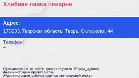 Хлебная лавка, пекарня по адресу 170033, Тверская область, Тверь, Склизкова, 44 в дальнейшем Организация, размещена в следующих категориях: