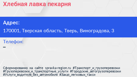 Хлебная лавка, пекарня по адресу 170001, Тверская область, Тверь, Виноградова, 3 в дальнейшем Организация, размещена в следующих категориях: