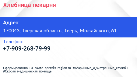 Хлебница, пекарня по адресу 170043, Тверская область, Тверь, Можайского, 61 в дальнейшем Организация, размещена в следующих категориях: