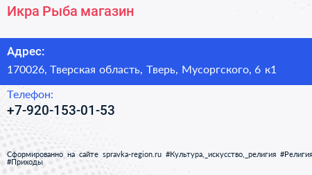 Икра & Рыба, магазин по адресу 170026, Тверская область, Тверь, Мусоргского, 6 к1 в дальнейшем Организация, размещена в следующих категориях: