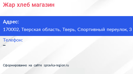 Жар-хлеб, магазин по адресу 170002, Тверская область, Тверь, Спортивный переулок, 3 в дальнейшем Организация, размещена в следующих категориях:
