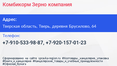 Комбикорм Зерно, компания по адресу Тверская область, Тверь, деревня Брусилово, 64 в дальнейшем Организация, размещена в следующих категориях: