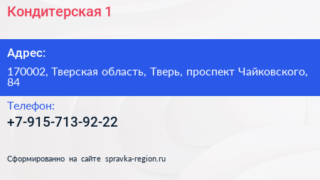 Кондитерская №1 по адресу 170002, Тверская область, Тверь, проспект Чайковского, 84 в дальнейшем Организация, размещена в следующих категориях: