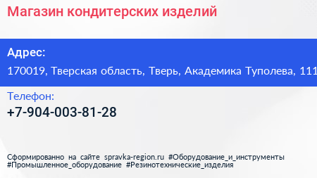 Магазин кондитерских изделий по адресу 170019, Тверская область, Тверь, Академика Туполева, 111 в дальнейшем Организация, размещена в следующих категориях: