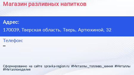 Магазин разливных напитков по адресу 170039, Тверская область, Тверь, Артюхиной, 32 в дальнейшем Организация, размещена в следующих категориях: