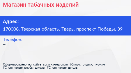 Магазин табачных изделий по адресу 170008, Тверская область, Тверь, проспект Победы, 39 в дальнейшем Организация, размещена в следующих категориях: