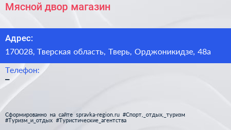 Мясной двор, магазин по адресу 170028, Тверская область, Тверь, Орджоникидзе, 48а в дальнейшем Организация, размещена в следующих категориях: