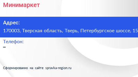 Минимаркет по адресу 170003, Тверская область, Тверь, Петербургское шоссе, 15 в дальнейшем Организация, размещена в следующих категориях: