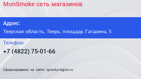 MonSmoke, сеть магазинов по адресу Тверская область, Тверь, площадь Гагарина, 5 в дальнейшем Организация, размещена в следующих категориях: