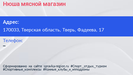 Нюша, мясной магазин по адресу 170033, Тверская область, Тверь, Фадеева, 17 в дальнейшем Организация, размещена в следующих категориях: