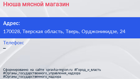 Нюша, мясной магазин по адресу 170028, Тверская область, Тверь, Орджоникидзе, 24 в дальнейшем Организация, размещена в следующих категориях: