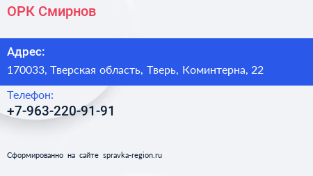 ОРК Смирнов по адресу 170033, Тверская область, Тверь, Коминтерна, 22 в дальнейшем Организация, размещена в следующих категориях: