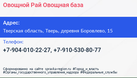 Овощной Рай, Овощная база по адресу Тверская область, Тверь, деревня Боровлево, 15 в дальнейшем Организация, размещена в следующих категориях: