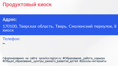 Продуктовый киоск по адресу 170100, Тверская область, Тверь, Смоленский переулок, 8 киоск в дальнейшем Организация, размещена в следующих категориях:
