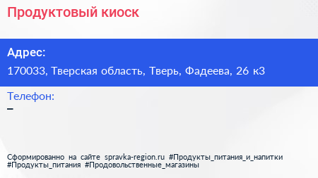 Продуктовый киоск по адресу 170033, Тверская область, Тверь, Фадеева, 26 к3 в дальнейшем Организация, размещена в следующих категориях: