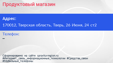 Продуктовый магазин по адресу 170012, Тверская область, Тверь, 26 Июня, 24 ст2 в дальнейшем Организация, размещена в следующих категориях: