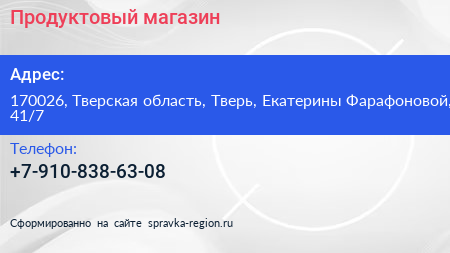 Продуктовый магазин по адресу 170026, Тверская область, Тверь, Екатерины Фарафоновой, 41/7 в дальнейшем Организация, размещена в следующих категориях:
