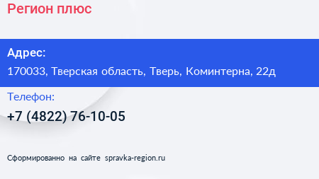 Регион плюс по адресу 170033, Тверская область, Тверь, Коминтерна, 22д в дальнейшем Организация, размещена в следующих категориях: