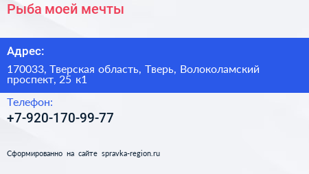 Рыба моей мечты по адресу 170033, Тверская область, Тверь, Волоколамский проспект, 25 к1 в дальнейшем Организация, размещена в следующих категориях: