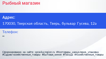 Рыбный, магазин по адресу 170030, Тверская область, Тверь, бульвар Гусева, 12а в дальнейшем Организация, размещена в следующих категориях: