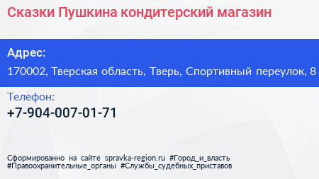 Сказки Пушкина, кондитерский магазин по адресу 170002, Тверская область, Тверь, Спортивный переулок, 8 в дальнейшем Организация, размещена в следующих категориях: