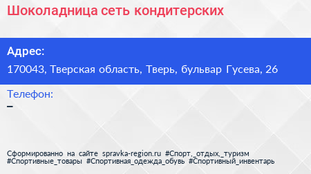 Шоколадница, сеть кондитерских по адресу 170043, Тверская область, Тверь, бульвар Гусева, 26 в дальнейшем Организация, размещена в следующих категориях: