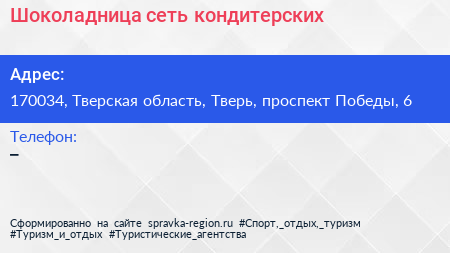Шоколадница, сеть кондитерских по адресу 170034, Тверская область, Тверь, проспект Победы, 6 в дальнейшем Организация, размещена в следующих категориях:
