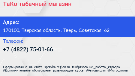 ТаКо, табачный магазин по адресу 170100, Тверская область, Тверь, Советская, 62 в дальнейшем Организация, размещена в следующих категориях: